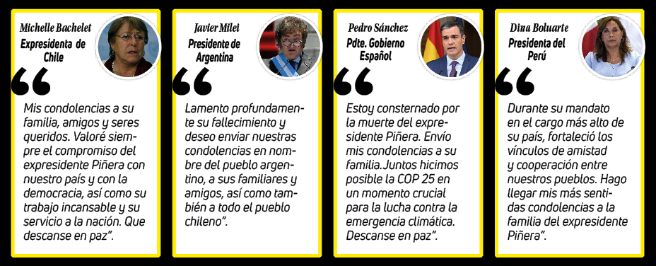 Diversos líderes mundiales expresaron su pesar por la muerte del expresidente chileno Sebastián Piñera. El exmandatario, de 74 años, falleció tras precipitarse el helicóptero que pilotaba en el lago Ranco.
