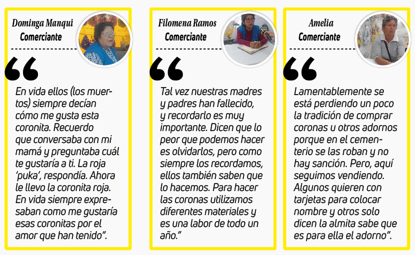 Poner coronas en las tumbas de los seres queridos en cada cementerio es una tradición que está latente en la sociedad, una forma de recordar a los familiares que partieron al más allá. Además, es una oportunidad de negocio de los comerciantes que desde enero del 2023 iniciaron la elaboración de las coronas para venderlas el 1 de noviembre, que es Día de Todos los Santos.