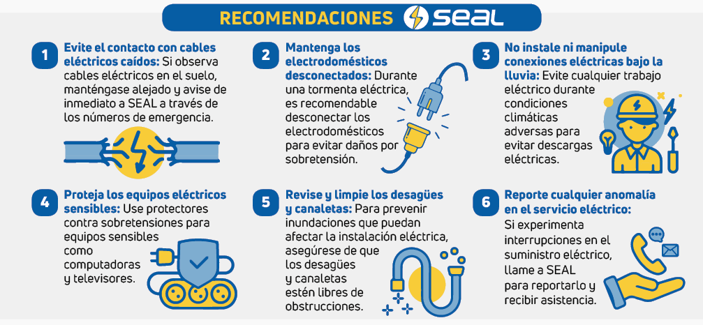 Es fundamental destacar que, con el objetivo de evitar dificultades y riesgos en el suministro de energía eléctrica, SEAL hace un llamado a la población para que realice la revisión y el mantenimiento de las instalaciones internas de sus domicilios.