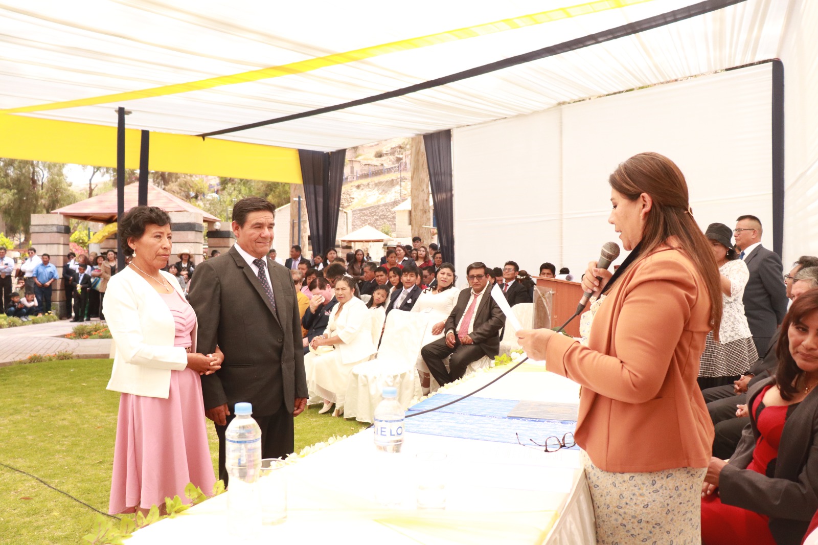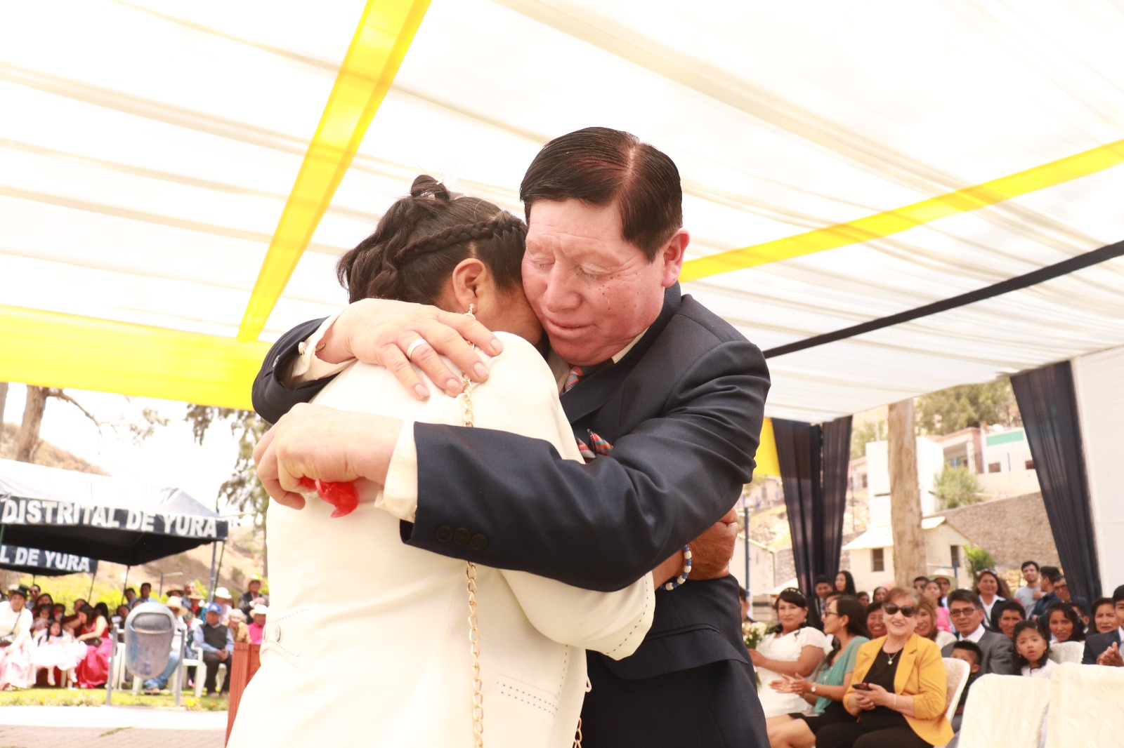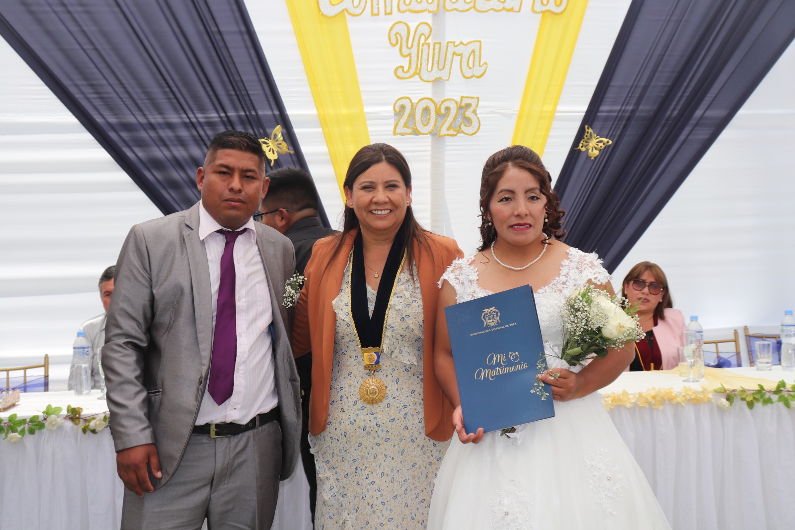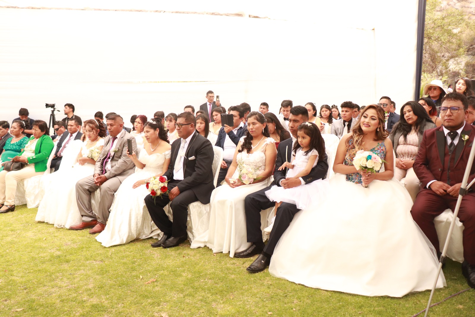 El Hotel de Turistas de Yura se vistió de gala para recibir a 23 parejas de novios que decidieron formalizar su vínculo sentimental en matrimonio civil comunitario por el 149.° aniversario del distrito, presidido por la alcaldesa Mirtha Ruelas Casillas.