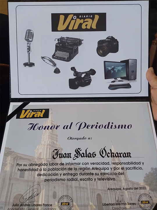 HOMENAJE EN VIDA. Diario Viral es el medio periodístico que lo homenajeó en vida y entregó un especial reconocimiento por su gran trayectoria periodística a Juan Fernando Salas Ocharán que siempre fue valorado no solo por su pluma, sino por la busca inagotable de la noticia sumándose a ello su calidad humana como su alegría que siempre la llevaba en su rostro.
