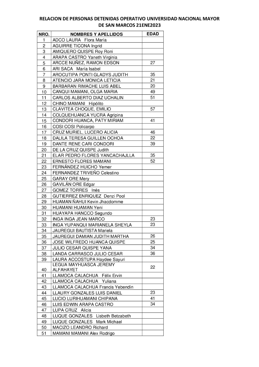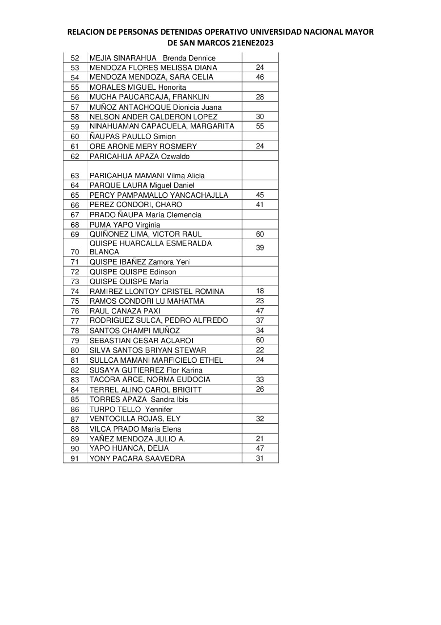 “En cumplimiento a la Ley de Transparencia y Acceso a la Información Pública, difundimos los nombres y en qué sede se encuentran las personas intervenidas durante el operativo policial realizado en la Universidad Nacional Mayor de San Marcos en Lima”, informó la Policía a través de sus redes sociales.
