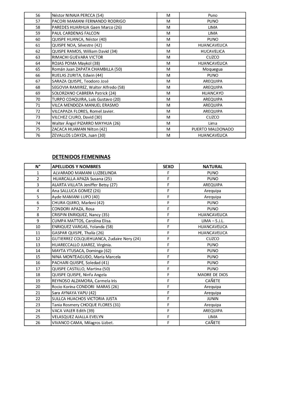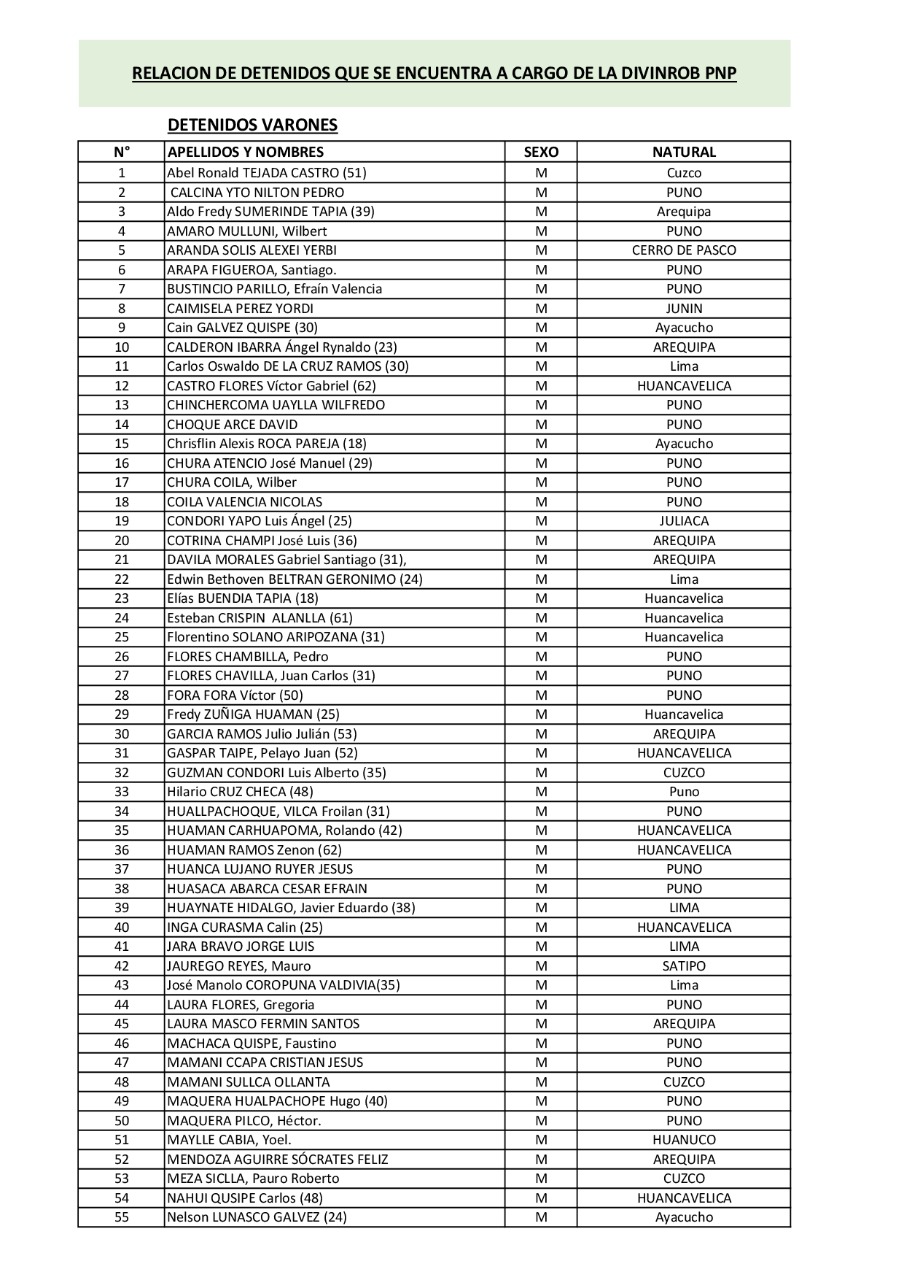 La entidad dio a conocer la relación de personas detenidas, de las cuales 102 personas permanecen en las instalaciones de la Dirincri y 91 personas están en las instalaciones de la Dircote.