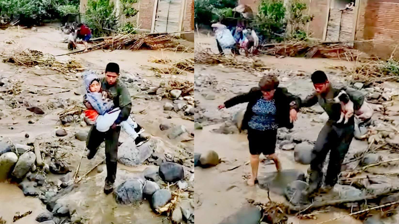 Un rescate de película. Personal del Ejército del Perú tuvo que trabajar contra el tiempo para rescatar a 20 personas aisladas, producto de las fuertes lluvias ocasionadas por el ciclón Yaku. Los pobladores quedaron atrapados en el segundo piso de una vivienda tras el desborde del río Virú en la región La Libertad.