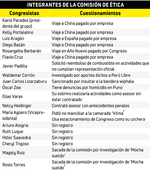 Los encargados de investigar y sancionar a los malos parlamentarios son los miembros de la Comisión de Ética, pero hasta la fecha solo hay respuestas suaves y blindajes. Esto se debería porque 13, de los 17 legisladores, de dicho grupo, también tienen cuestionamientos.