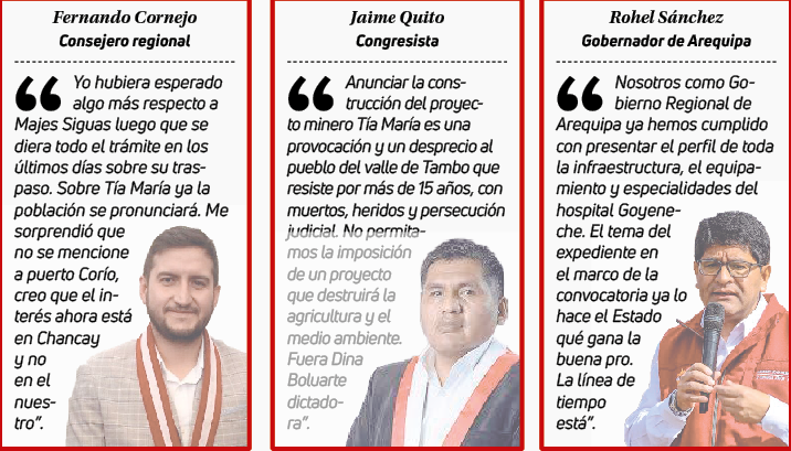 “Tía María no constituye un proyecto impuesto, eso es una falsa narrativa enarbolada por reducidos sectores ideologizados que se resisten a admitir que la minería es la actividad que afianza el crecimiento. Aportará S/400 millones anuales para Arequipa” finalizó.