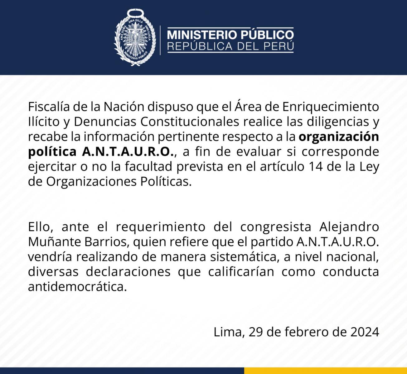 “Fiscalía de la Nación dispuso que el Área de Enriquecimiento Ilícito y Denuncias Constitucionales realice las diligencias y recabe la información pertinente respecto a la organización política ANTAURO, a fin de evaluar si corresponde ejercitar o no la facultad prevista en el artículo 14 de la Ley de Organizaciones Políticas”, señaló el Ministerio Público a través de su cuenta de X.