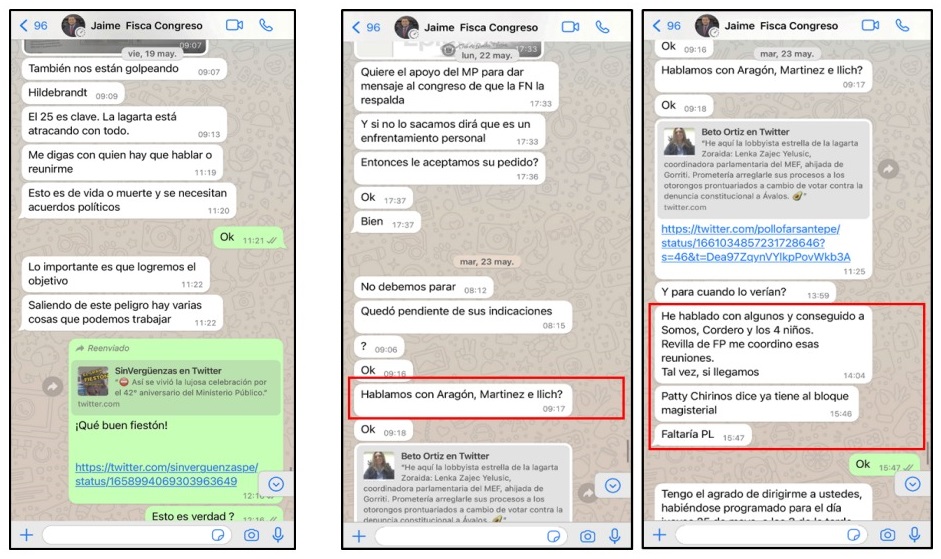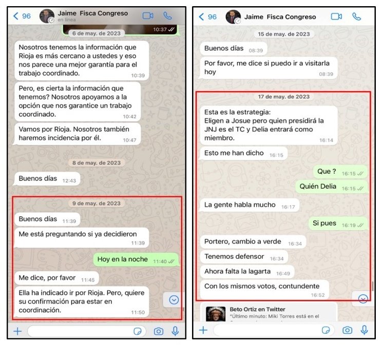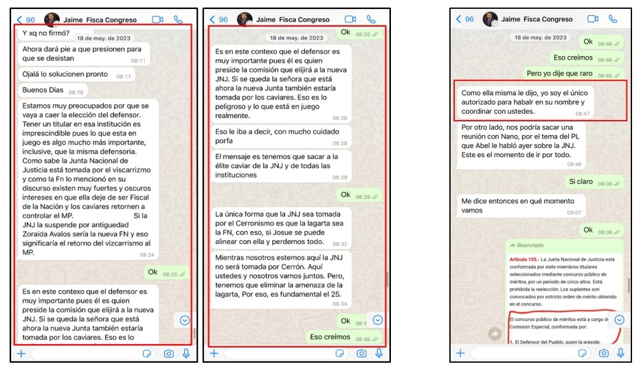 “Estamos muy preocupados porque se vaya a caer la elección del defensor. Tener un titular en esa institución es imprescindible, pues lo que está en juego es algo mucho más importante, inclusive que la misma Defensoría. Como sabe la Junta Nacional de Justicia está tomada por el ‘Vizcarrismo’ y como la fiscal de la Nación lo mencionó en su discurso, existen muy fuertes y oscuros intereses en que ella deje de ser fiscal de la Nación y los caviares retornen a controlar el Ministerio Público. Si la JNJ la suspende por antigüedad, Zoraida Avalos sería la nueva fiscal de la Nación y eso significaría el retorno del ‘Vizcarrismo’ al Ministerio Público”, se lee en los mensajes.