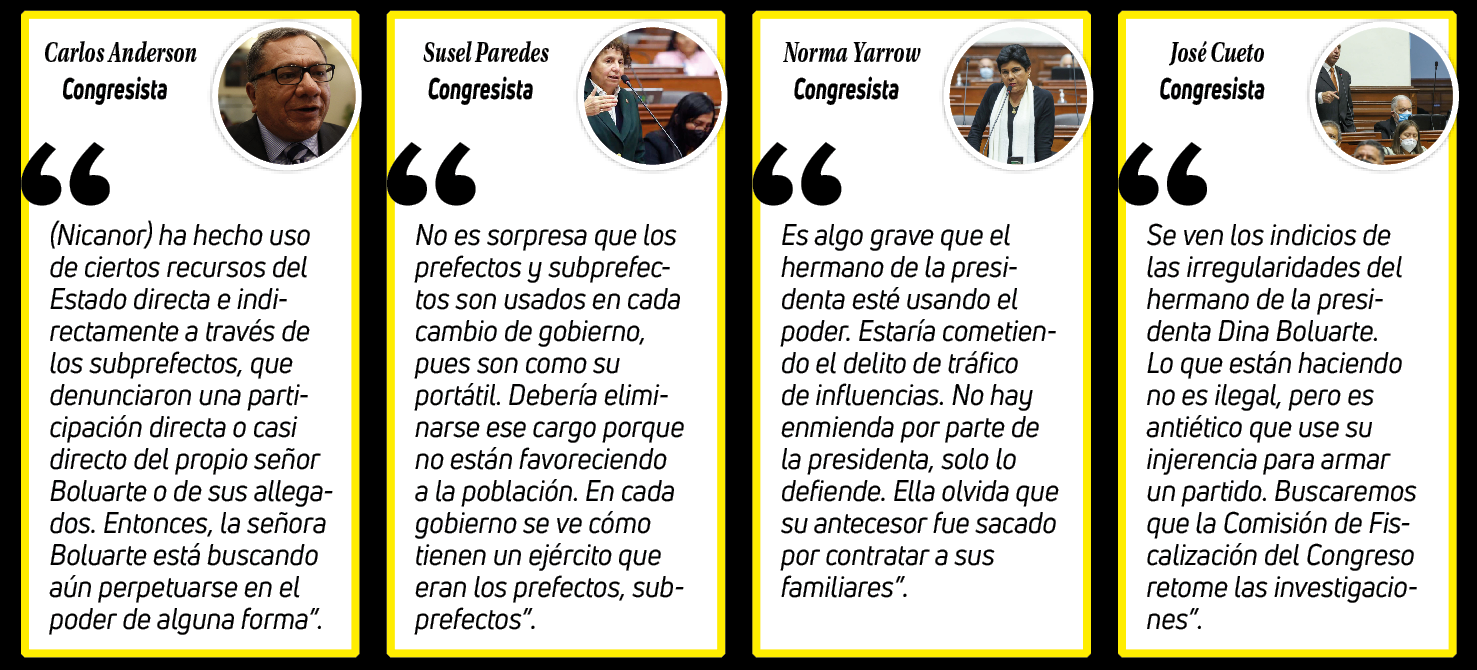 Luego que se revelara que el hermano de la presidenta Dina Boluarte usa a los prefectos y subprefectos para recolectar firmas para su partido, los congresistas se pronunciaron y recordaron a la mandataria que su antecesor Pedro Castillo fue sacado por favorecer a sus parientes.