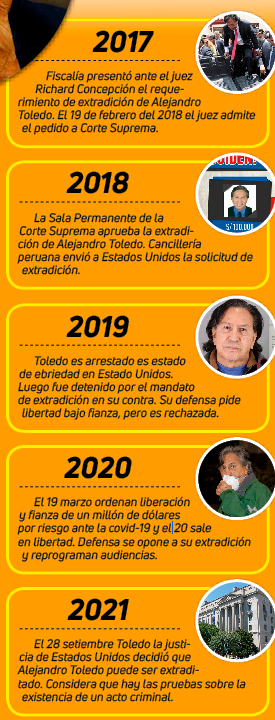 El proceso de extradición duró seis años (ver línea de tiempo) y aún no culmina pues, para que Toledo llegue al Perú, tardaría dos meses según el fiscal superior Alfredo Rebaza. Explica que primero se tiene que coordinar entre ambos estados para que el ex jefe de Estado se entregue y sino es así detenerlo.