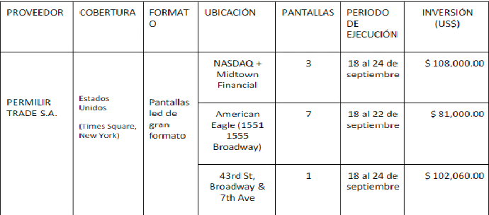 Según el documento, Promperú contrató a la empresa uruguaya Permilir Trade S.A para que coloque los avisos en tres edificios de Nueva York. Además se alquilaron un total de 11 pantallas durante la estadía de Boluarte Zegarre (ver cuadro de gastos).