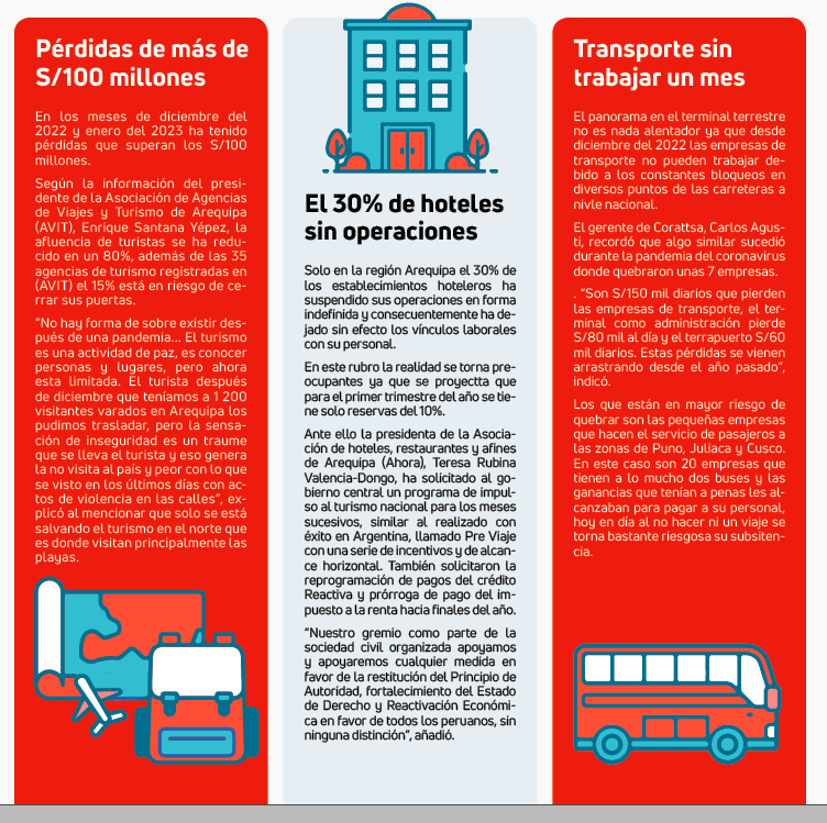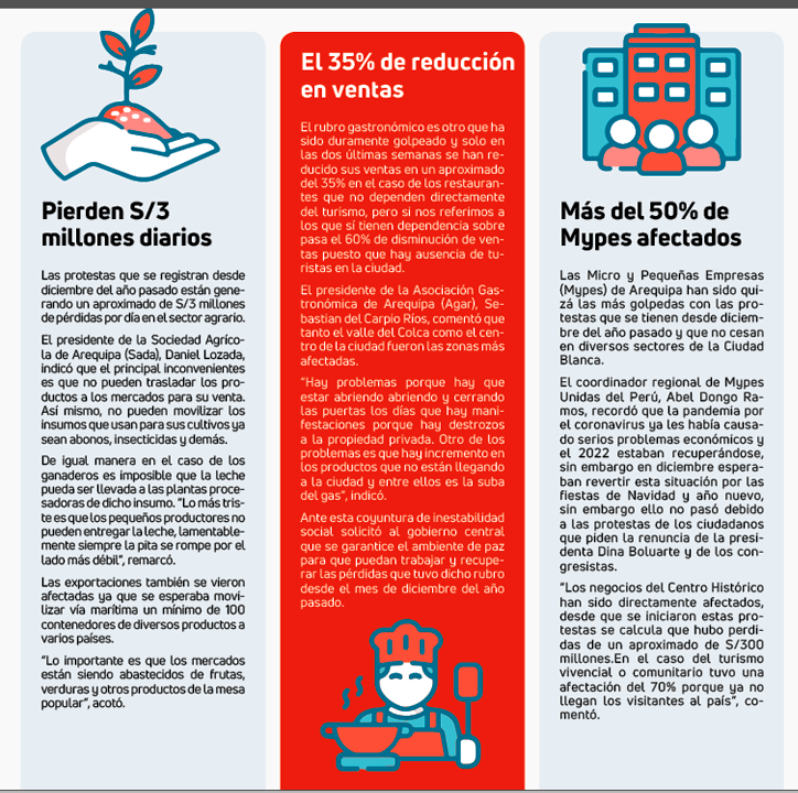Arequipa. Las constantes protestas, bloqueos de carreteras, actos vandálicos, intentos de toma del aeropuerto no han sido nada favorables para la región Arequipa que ha resgistrado millonarias pérdidas económicas que superan los 1000 millones de soles en los diversos sectores, según el presidente de la Cámara de Comercio e Industria de Arequipa, Luis Caballero.