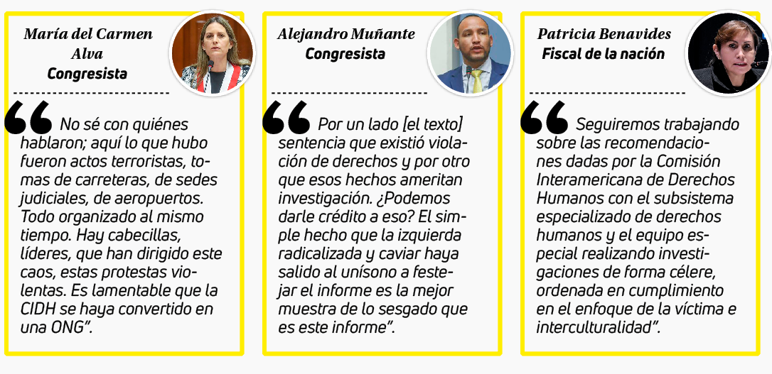 CONGRESO. Tras la publicación del informe, varios parlamentarios mostraron su opinión. Desde el bloque de derecha pidieron que Perú se retire del CIDH y calificaron como sesgado el documento. Mientras que la izquierda mostraron su respaldo. Sobre ello, Boluarte no se quedó callada y señaló que los de izquierda esperaban que el informe diga su “narrativa falsa”, así como aclaró que no se saldrán de la CIDH.