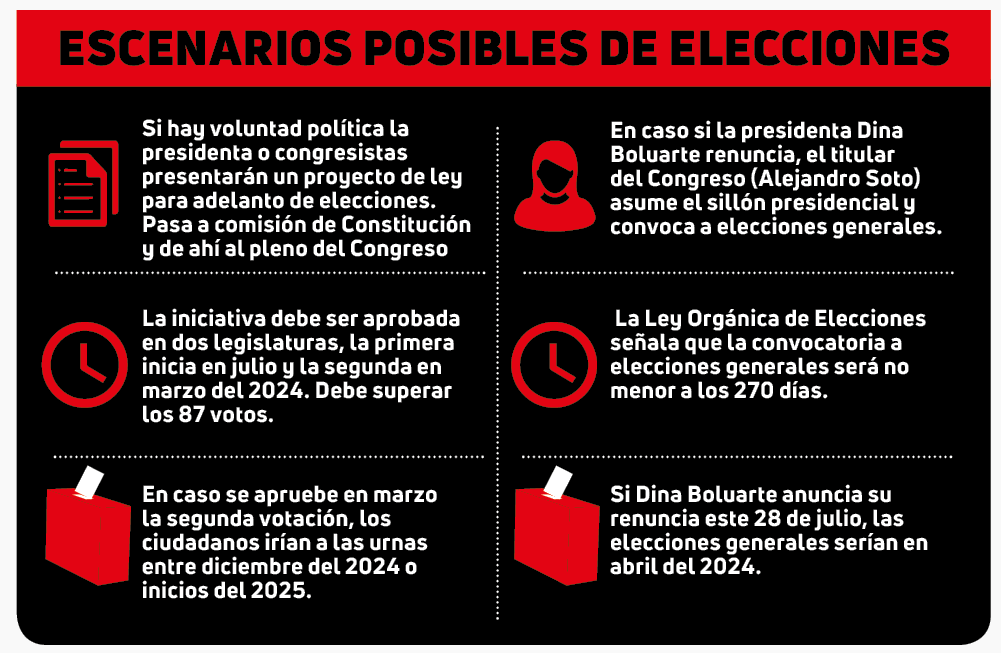 En las protestas, el pedido es adelanto de elecciones, en caso se presente un proyecto de ley y el Congreso lo apruebe, los comicios generales serían para finales del 2024 o inicios del 2025, explicó el experto electoral Jorge Mamani. En caso de que renuncie Boluarte, se podría dar en menos tiempo, según la ley, en nueve meses. Sheput señala que la respuesta está en manos de Boluarte porque los parlamentarios no quieren irse.