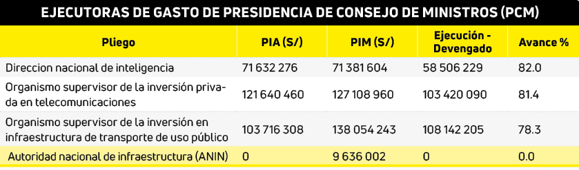 Según Transparencia del MEF esta es la única subcategoría de gasto de la PCM en la que no se invirtió un sol a diferencia de otros organismos supervisores, programas de inversión, servicios de inteligencia y promoción de la tecnología, entre otros. Todos los mencionados sobrepasan devengados del 78 %.