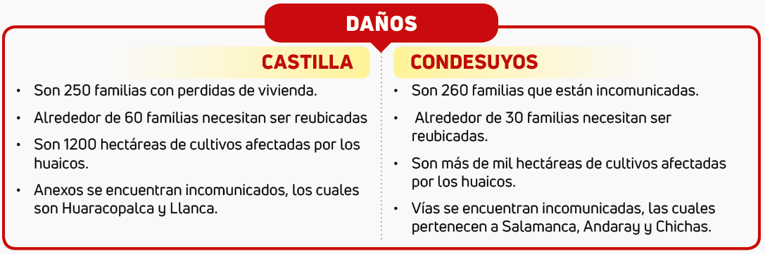Los alcaldes provinciales de Condesuyos y Castilla, Edwar Urday Torres y Renzo Pastor Alatrista, respectivamente, solicitan mayor apoyo al Centro de Operaciones de Emergencia Regional (COER) para que les envíen las maquinarias que faltan a fin de restablecer las carreteras lo más pronto posible.