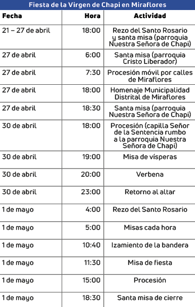 Las actividades por la festividad de la Mamita continuarán, el 30 de abril con la víspera, iniciando la procesión desde la capilla del Señor de la Sentencia hasta la parroquia de Chapi Chico. En la noche de ese día se realizarán las misas y verbena. El 1 de mayo se tienen previstas misas cada hora y la misa de fiesta a las 11:30 horas y la procesión (ver cuadro).